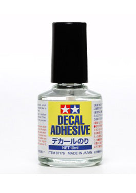 This is Tamiya decal adhesive. It is perfect for giving adhesive power to decals which have sat too long in water and lost their stickiness or become prone to silvering (when the clear face of the decals whitens). • Simply apply to the area of the model where the decal is to be placed, and then apply decal. •Comes in a 10ml bottle with cap brush for handy application. •Water-based liquid makes for safe work, and can also be removed with a wet cloth if it escapes from under the decal.
