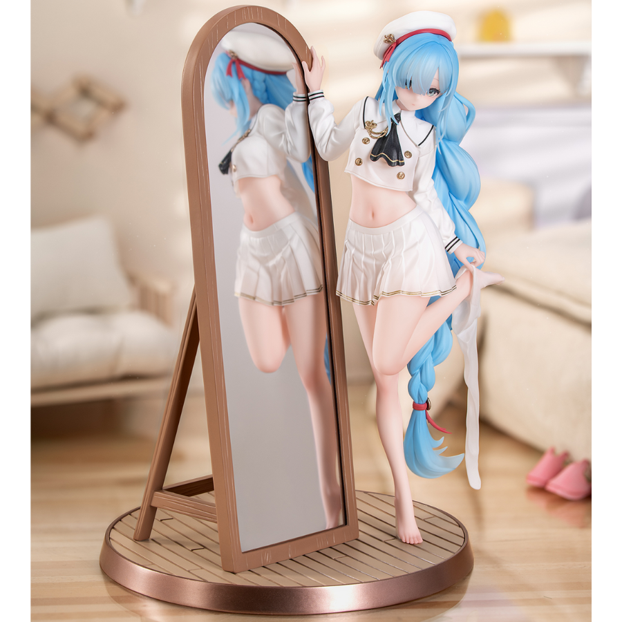 Janus braces her hand against the full-length mirror, her expression carries a mix of shyness and hesitation. She’s dressed in a sailor-style outfit with a cropped top and skirt, her exposed skin is tinged with pink due to her shyness. With one foot lifting up gently, she pinches the edge of her white socking between her fingers as she’s pulling it off. She wears her hair in a braided ponytail, and the long blue strands cascade over her left shoulder. Her hair is in gradient color that transitions from blue to translucent. Her reflection in the full-length mirror adds a touch of realism and additional charm to the figure.