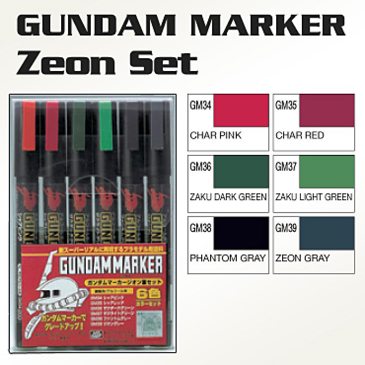 Here's a set of markers designed to give your Zaku II--Char custom or otherwise--a more detailed look upon completion! All 6 paint markers are exclusive to this set: GM34 Char Pink, GM35 Char Red, GM36 Zaku Dark Green, GM37 Zaku Light Green, GM38 Phantom Gray, and GM39 Zeon Gray!